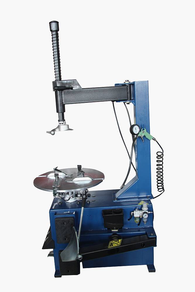 Полуавтоматический шиномонтажный стенд для легковых автомобилей. Облегчает демонтаж и монтаж шин с внутренним диаметром от 10 до 22 дюймов.