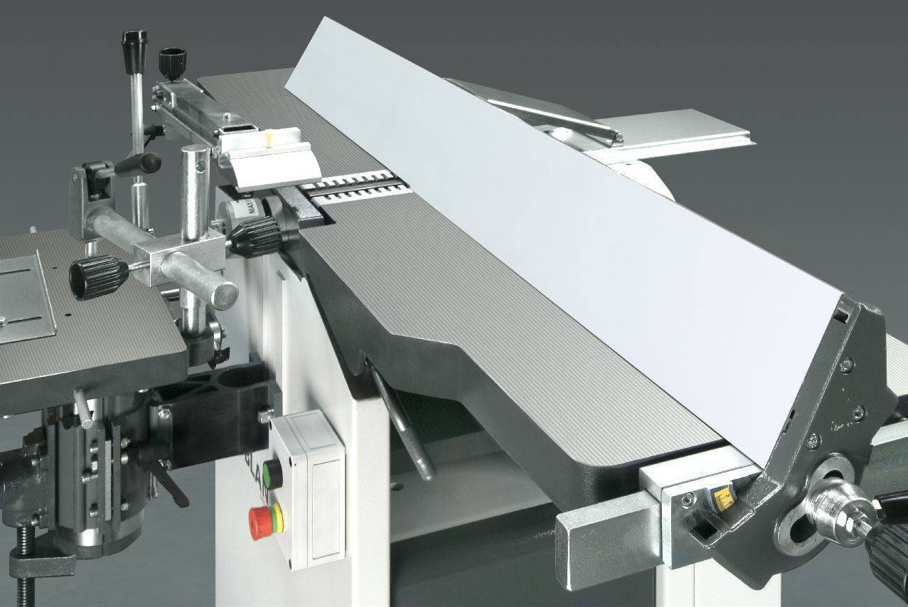 - Два чугунных фуговальных стола, установленных на точных направляющих, с возможностью регулировки подъема/опускания;