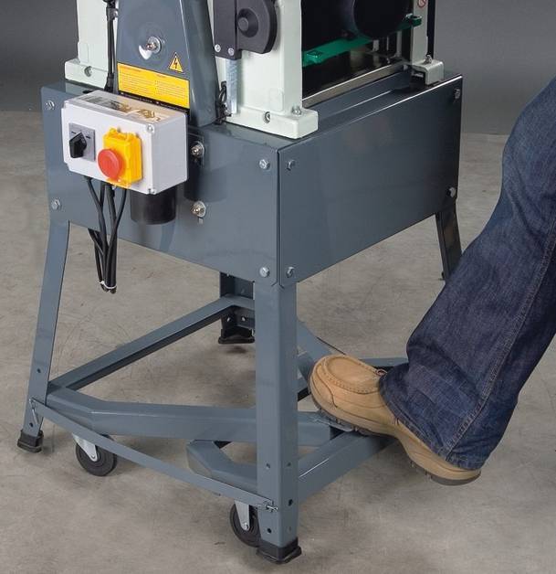 - Встроенное в подставку шасси с двумя направляющими роликами делает перемещение станка легким и удобным;