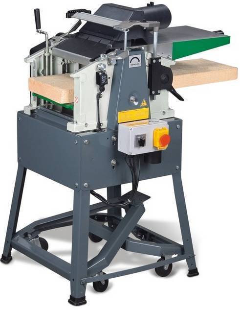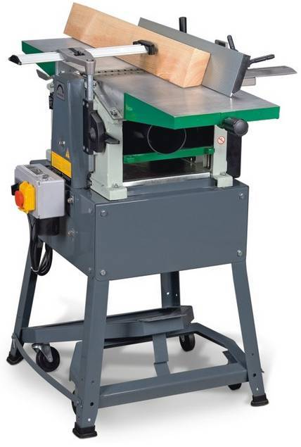 - Строгальный (фуговально рейсмусовый) станок с шириной строгания 260 мм, чугунным рейсмусовым столом, двумя строгальными ножами и встроенным в подставку шасси. Стальной вал подачи с зубчатой нарезкой и обрезиненый выходной вал;