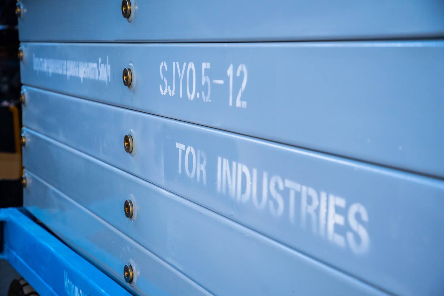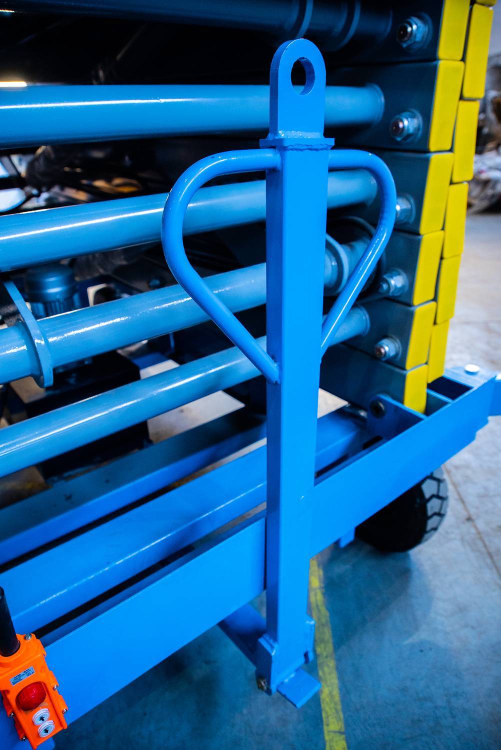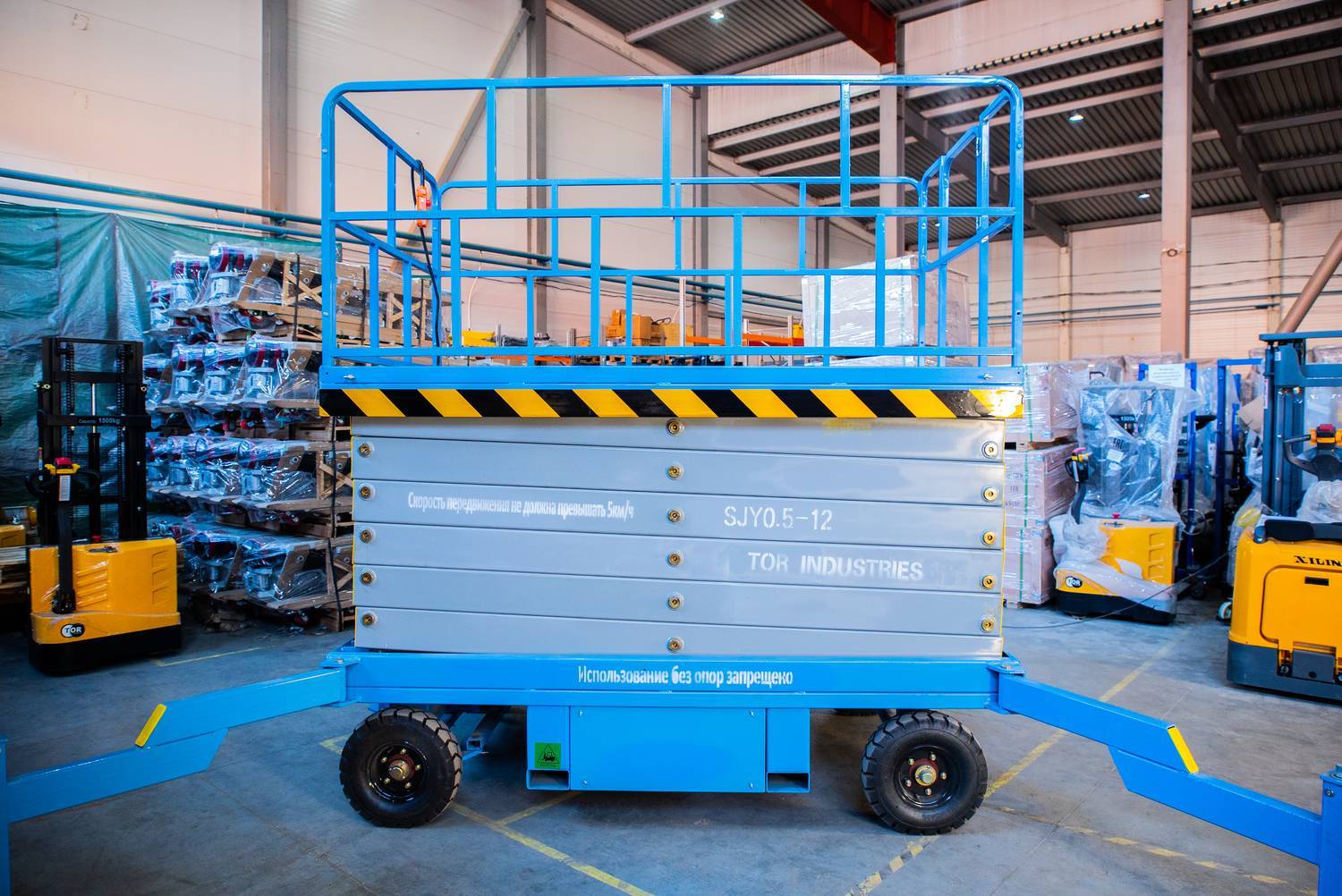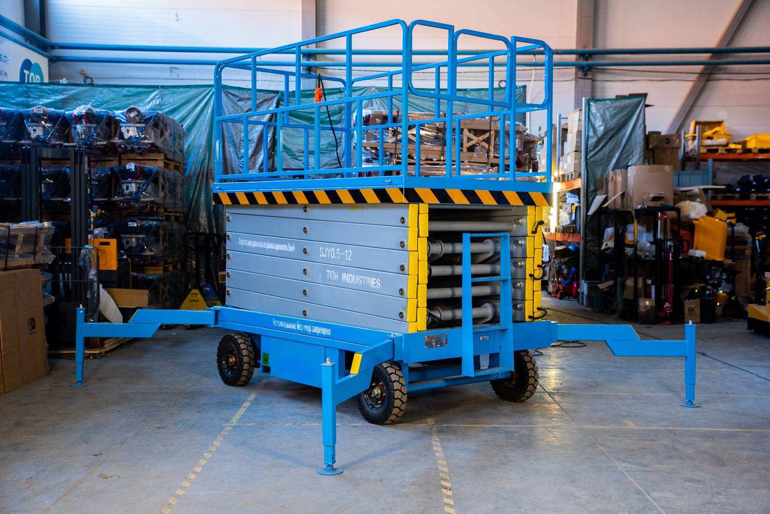 Передвижной ножничный подъемник TOR SJY DC. Модель оснащена аккумулятором, подъем площадки осуществляется за счет работы электромотора, передвижение за счет внешнего усилия.