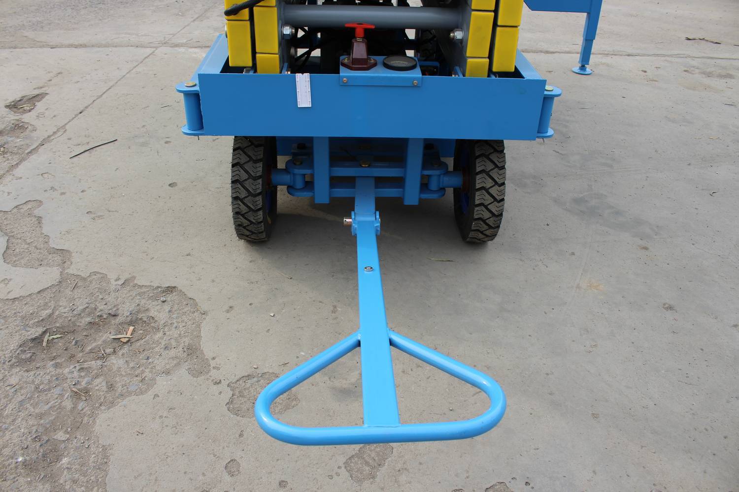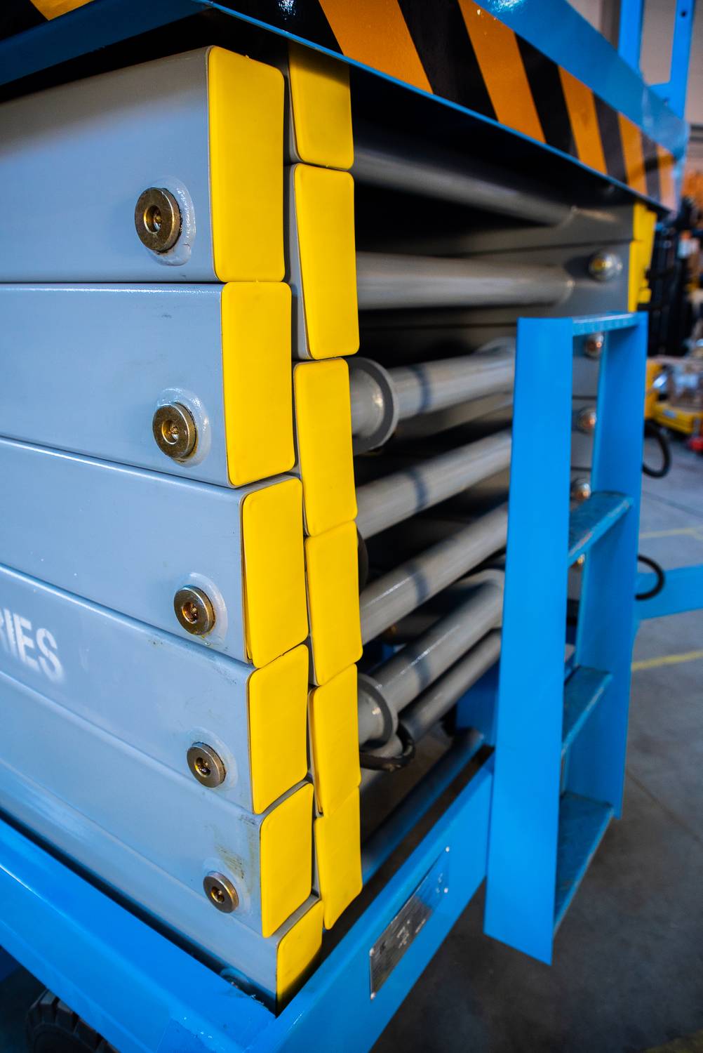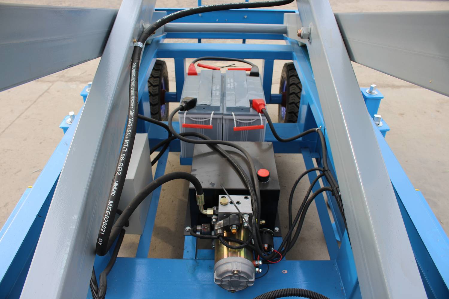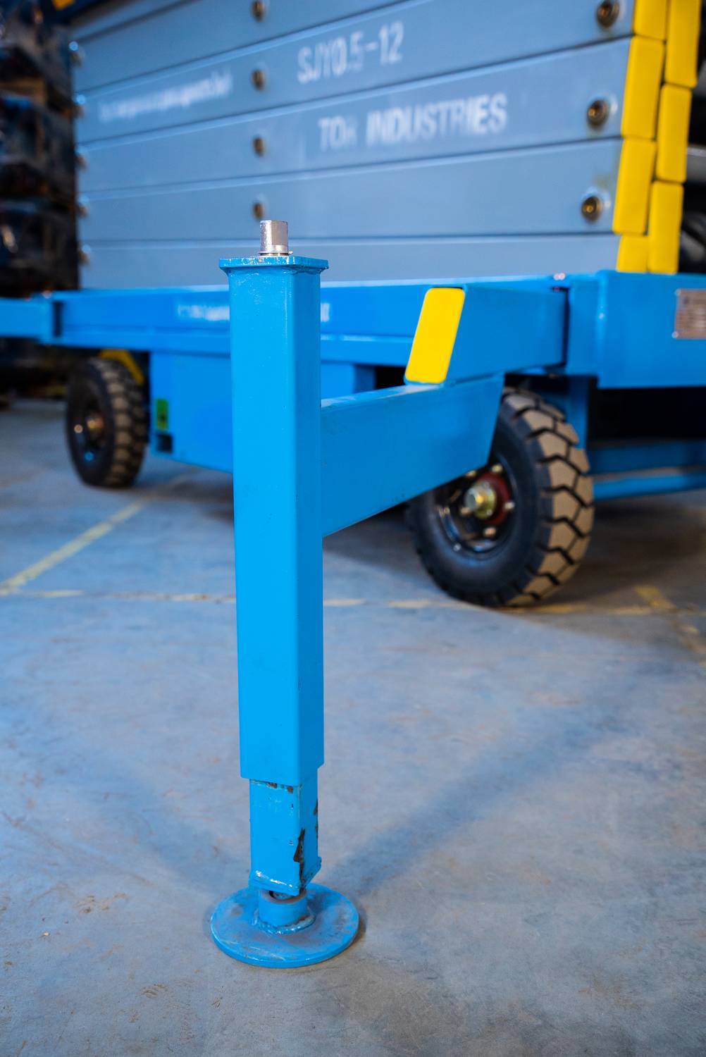 Передвижной ножничный подъемник TOR SJY DC. Модель оснащена аккумулятором, подъем площадки осуществляется за счет работы электромотора, передвижение за счет внешнего усилия.