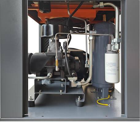 Внутри компактного корпуса расположен винтовой блок, двигатель, системы охлаждения и смазки.