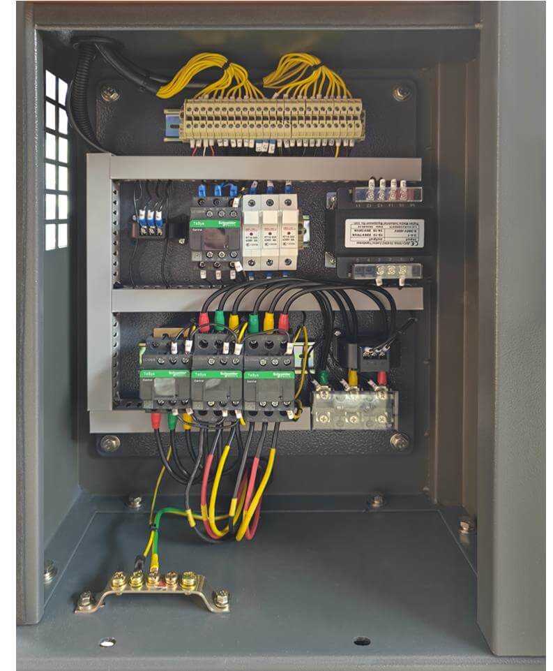 Все электрокомпоненты компрессорной станции удобно и безопасно размещены в электро-шкафу, расположенном под панелью управления.