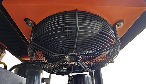 Встроенный вентилятор охлаждения включается автоматически при достижении компрессором температуры 90°С. Сжатый воздух охлаждается в радиаторе и подается на выход установки.