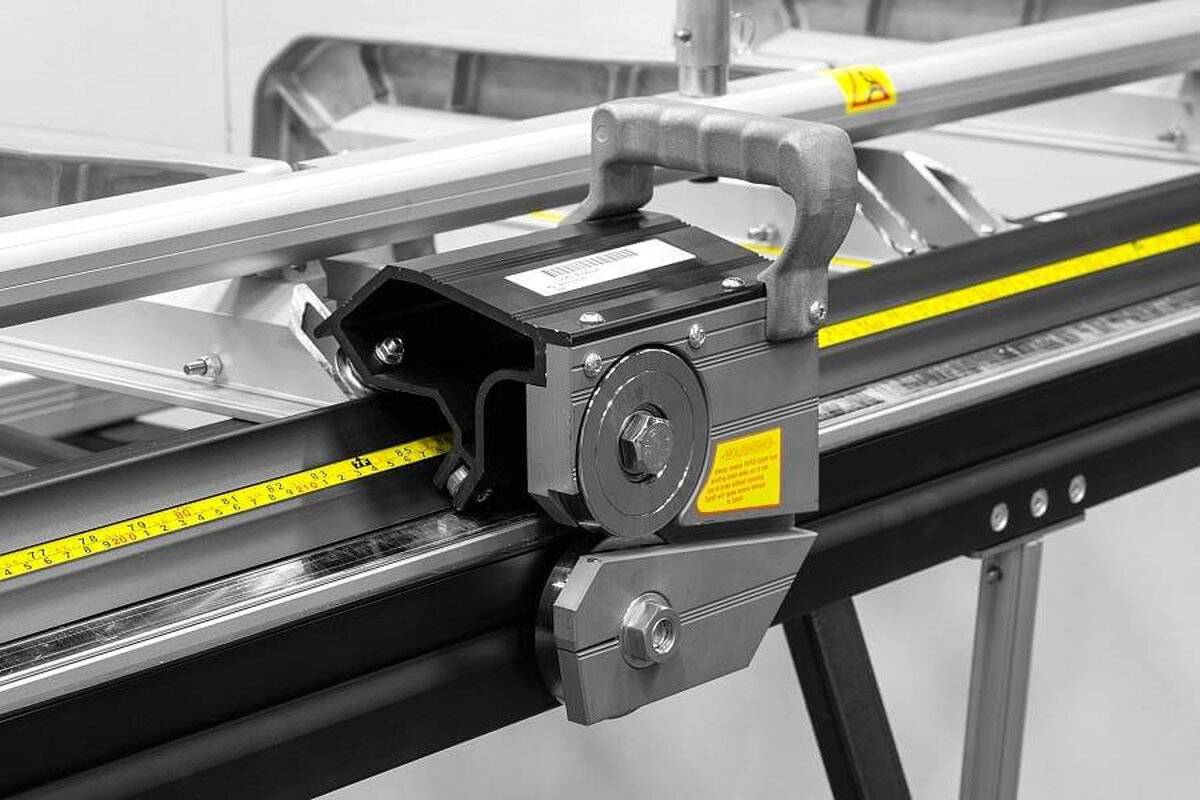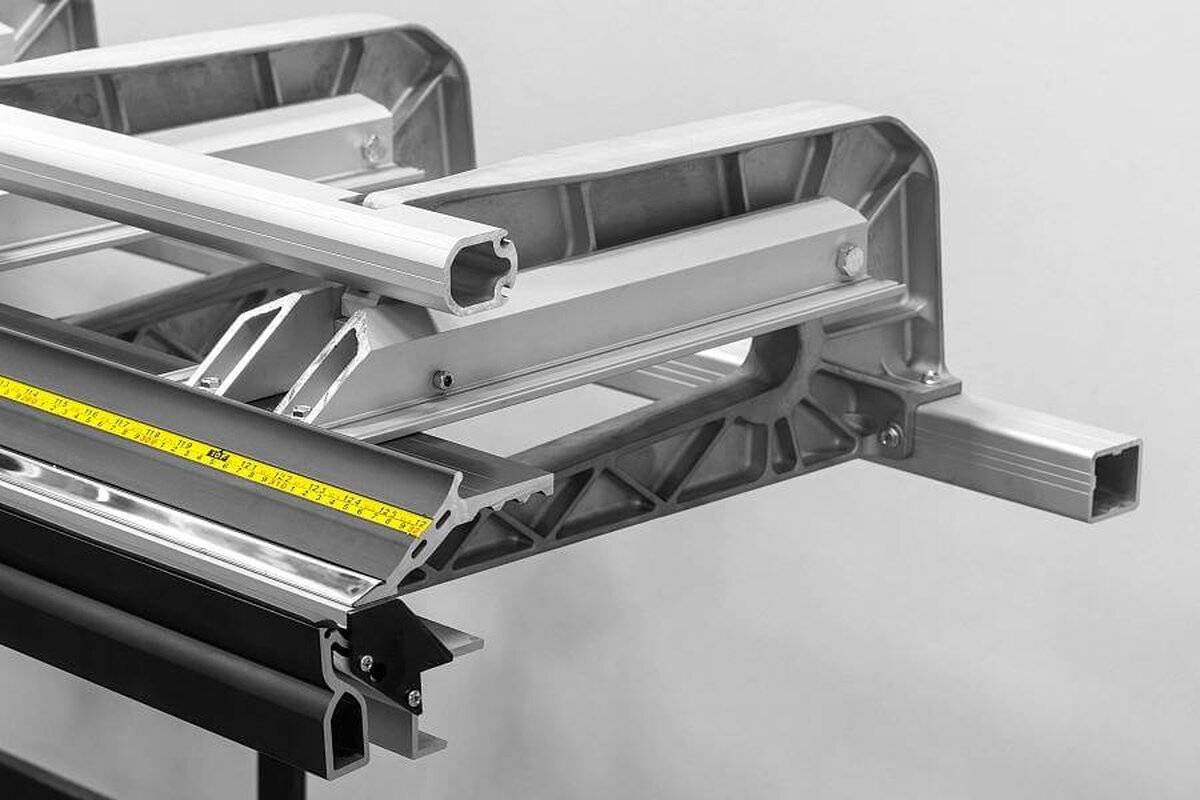 Изготовлена из усиленного алюминиевого профиля. В конструкции предусмотрен «рельс» для роликового ножа и установки угломеров. Кромка планки имеет радиус всего 2мм и дополнительно защищена от повреждения стальным уголком.