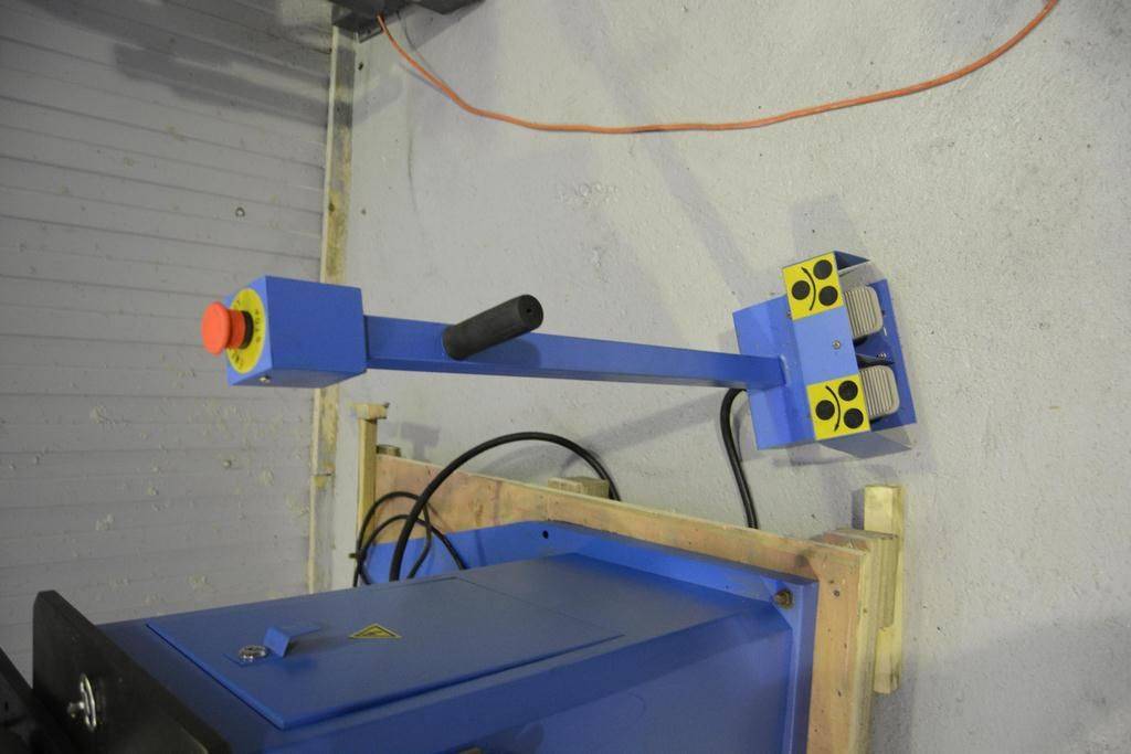 Стойка управления с двумя ножными педалями и кнопкой аварийной остановки, снабжена удобной ручкой для переноски.