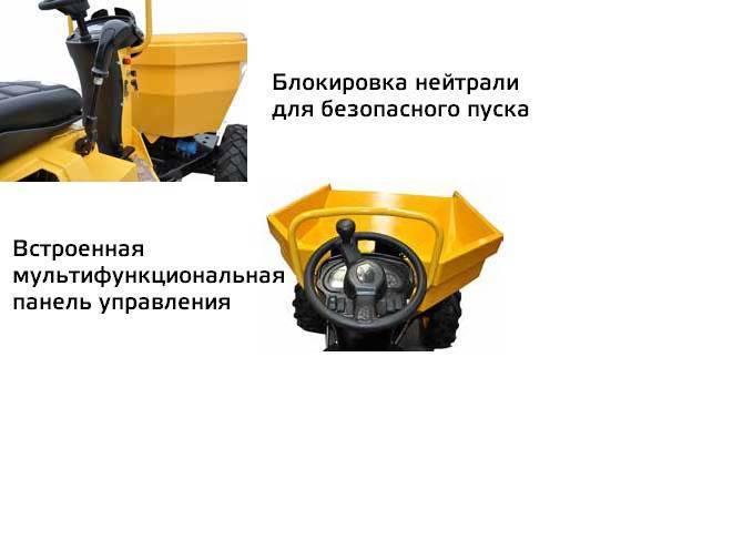 Cпециализированная колесная самоходная самосвальная машина GROST DM1500 (Думпер). Номинальная грузоподъемность бункера 1500кг. Мультифункциональная система управления бункером позволяет поварачивать его на 270° и наклонять вперед, влево и вправо, что значительно увеличивает его возможности при выполнении различных задач