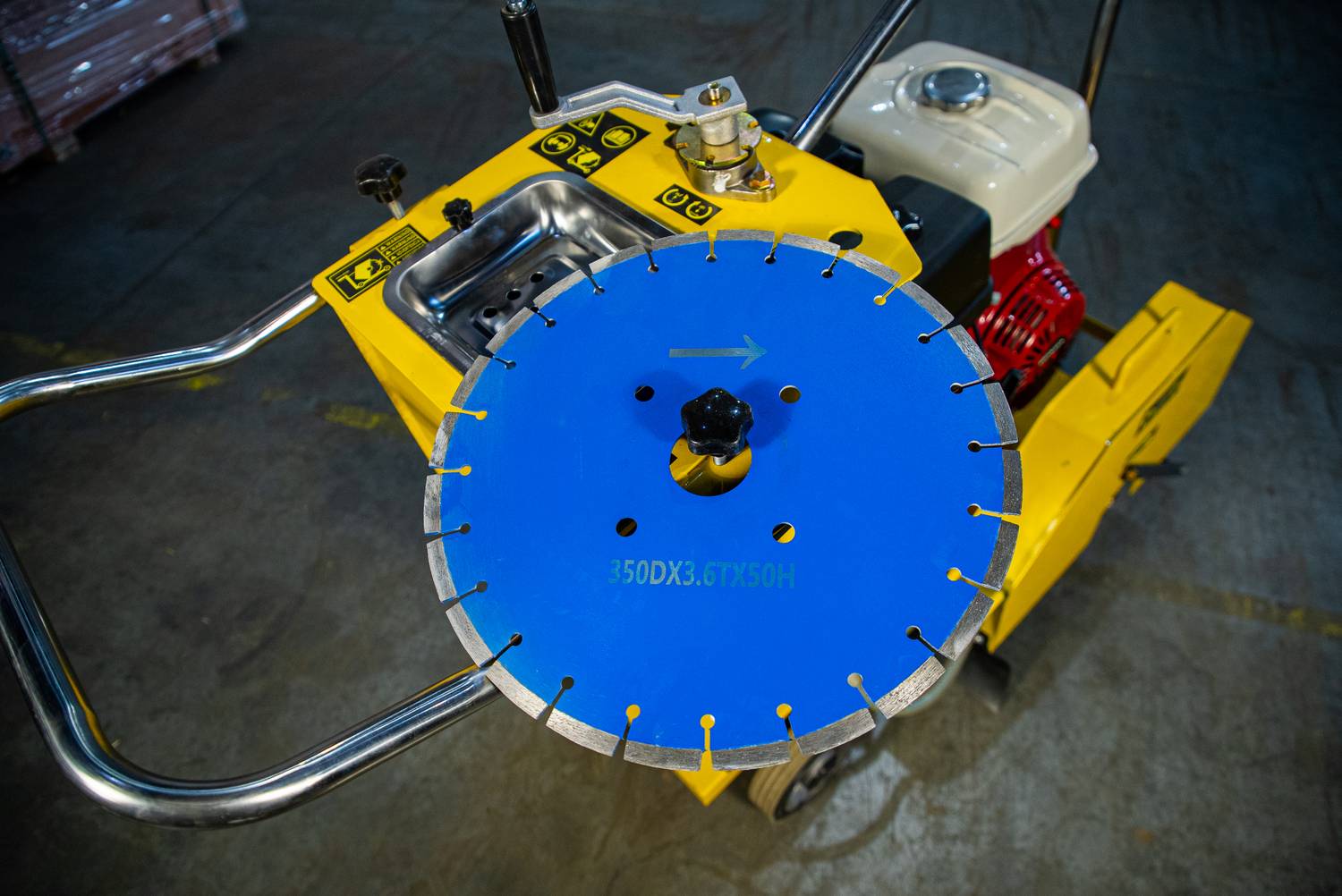- Оснащен баком для воды для снижения количества пыли при проведении работы, а также для охлаждения режущего диска